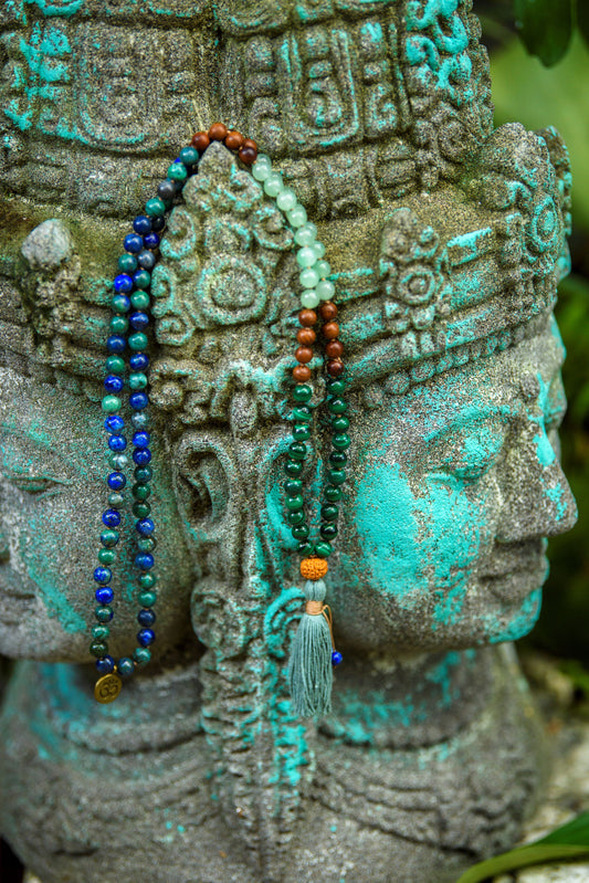 Azurite Mala, Malachite, Green Aventurine & Sandalwood Necklace, 108 Mala Beads for Balance, Growth and Prosperity