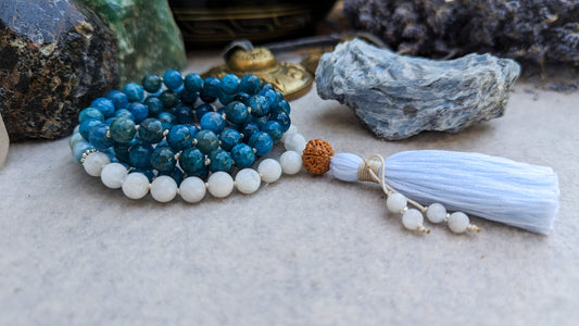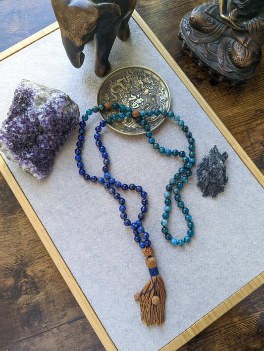 Blue Apatite and Lapis Lazuli, Throat, Third Eye Chakra Beaded Mala, Protection & Intuition Mala, Buddhist Prayer Beads, 108 Mala Necklace