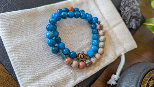 Blue Apatite and Serpentine Bracelet Set 8mm Stretch Mala Bracelets with Hamsa Hand for Protection & Balance