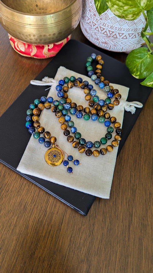 Azurite & Tiger Eye 108-Bead Mala Reiki-Infused Meditation Necklace for Strength, Clarity, and Spiritual Healing