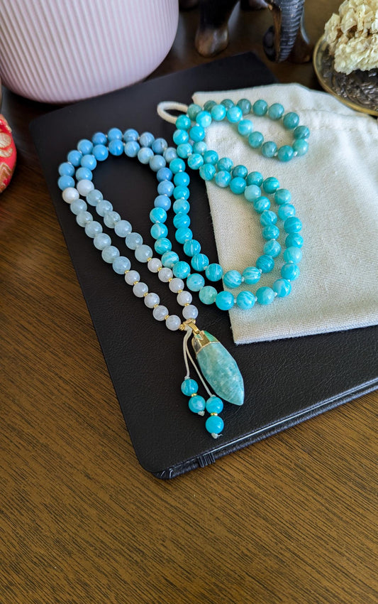 Amazonite, Larimar, Aquamarine & Moonstone Mala 108 Bead Reiki-Infused Meditation Necklace with Amazonite Pendant