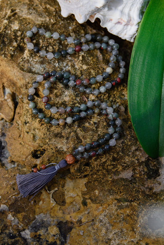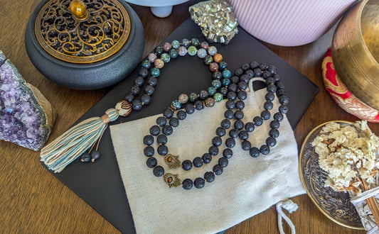 108 Bead Lava Rock & Indian Agate Mala Grounding and Balance Mala Necklace | Reiki-Infused Meditation Beads with Soft Bamboo Tassel