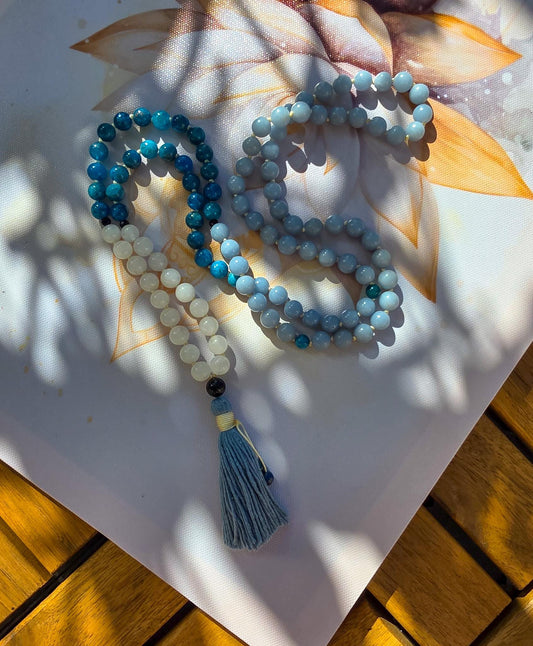 APATITE LARIMAR and MOONSTONE Mala, 108 Japa Mala, Meditation Beads, Buddhist Prayer Beads, Yoga Mala Necklace, Throat Chakra Necklace