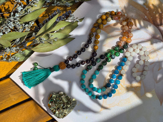 7 Chakra Mala Beads 108 Hand-Knotted Reiki-Infused Meditation Necklace | Healing Gemstone Prayer Beads for Chakra Alignment & Balance