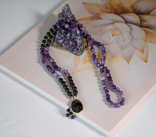 Amethyst & Tourmaline Mala Beads 108 Reiki-Infused Meditation Necklace with Tourmaline Pendant