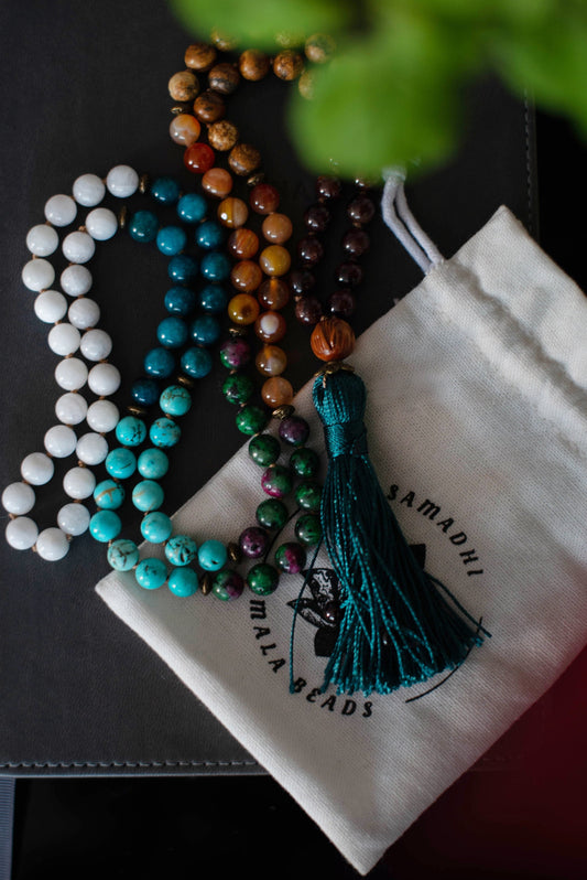 Angelite, Apatite & White Jade Japa Mala 108 Reiki-Charged Beads | Handmade Meditation Necklace for Healing