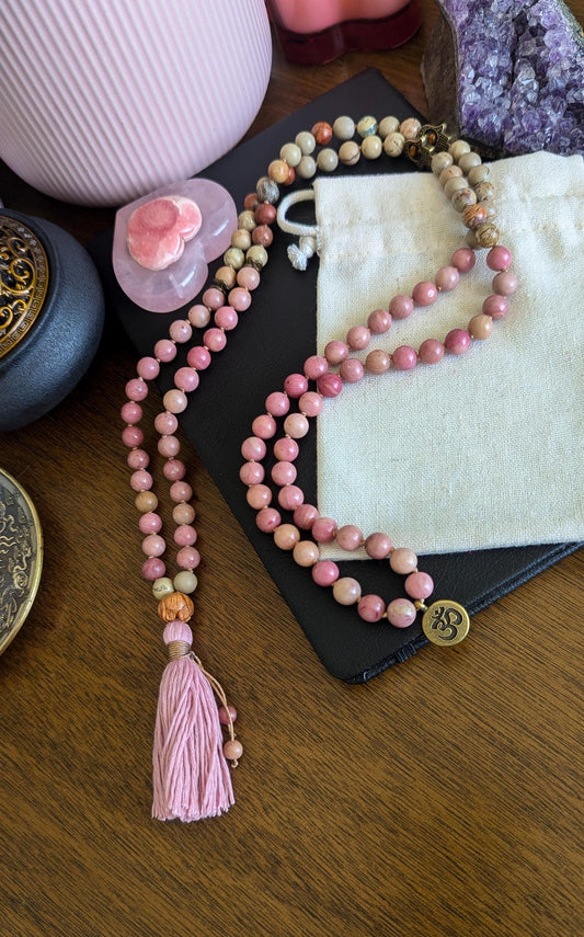 Healing Love Mala, Rhodochrosite & Serpentine 108 Bead Mala Reiki Infused Healing Necklace for Meditation and Energy Balance