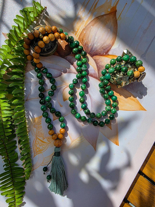 Green Aventurine, Sandalwood & Azurite Mala 108 Bead Reiki-Infused Meditation Necklace for Healing, Mindfulness and Intention Setting