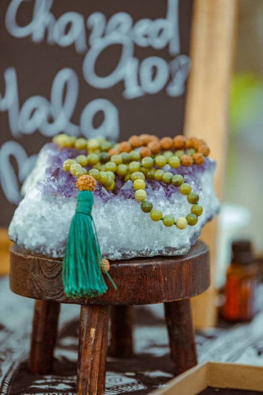 Jade and Tulsi Wood Mala Beads 108 Hand-Knotted Reiki-Infused Meditation Necklace, Spiritual Prayer Beads for Healing & Mindfulness