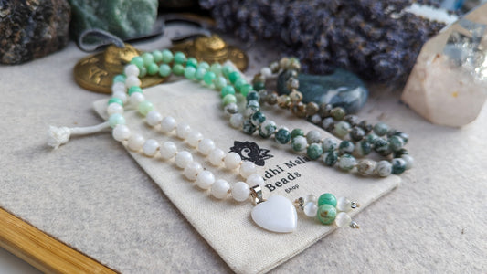 Moonstone, Moss Agate & Chrysoprase Mala with a white jade Heart pendant, 108 Beads Mala, Reiki-Infused Meditation Beads, Yoga Gift for Mum