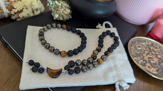 Lava Rock, Pyrite & Tiger's Eye Wrist Mala and Pocket Mala Set Reiki-Infused Bracelet for Strength, Protection and Grounding