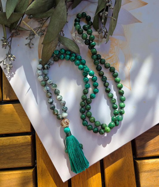 Jade, Malachite & Moss Agate Mala Beads 108 Reiki-Infused Meditation Necklace | Hand-Knotted Healing Gemstone Japa Mala