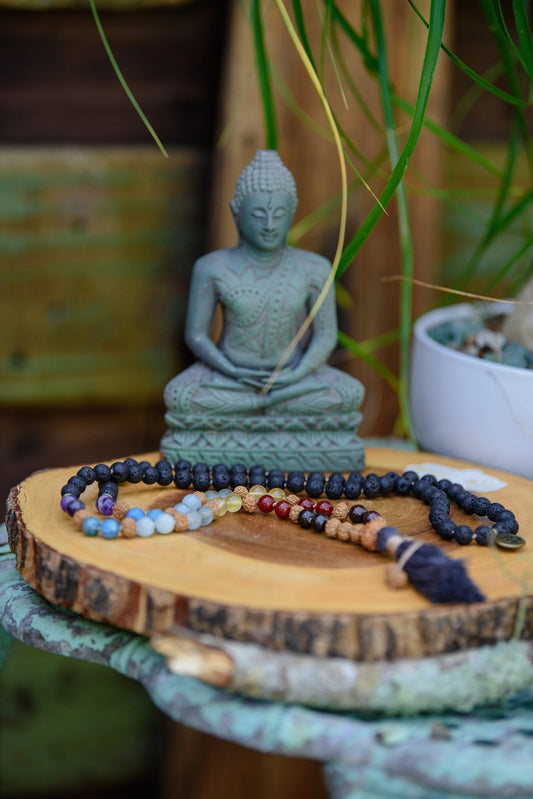 Mala, 7 Chakra Mala Necklace, Lava Rock Mala, 108 Mala Beads Necklace, Buddhist Prayer Beads, Reiki Healing Beads, Knotted Mala Necklace