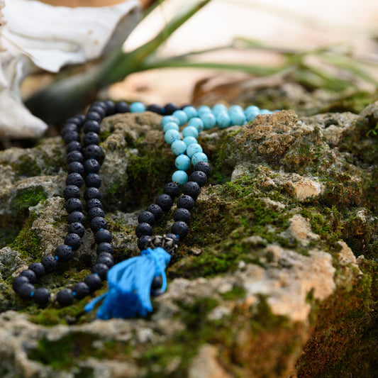 Mala Beads 108, Lava Rock & Tourquoise Mala Necklace, Throat Chakra Japa Mala, Buddhist Prayer Beads, Reiki Healing Beads